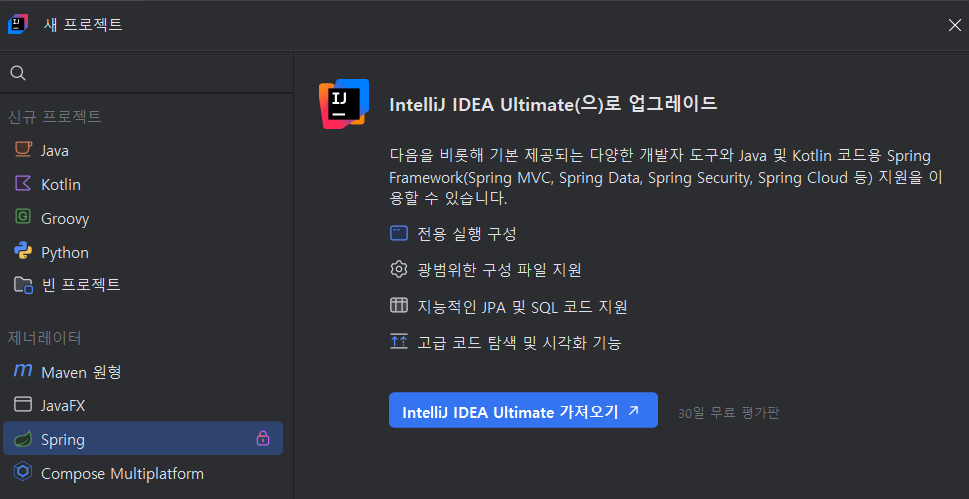 스프링 레거시 프로젝트를 수업에서 eclipse와 비슷한 Spring sts로 생성하였으나, 인텔리제이 환경에서 작업을 해보고 싶어 처음부터 세팅해보았다.
