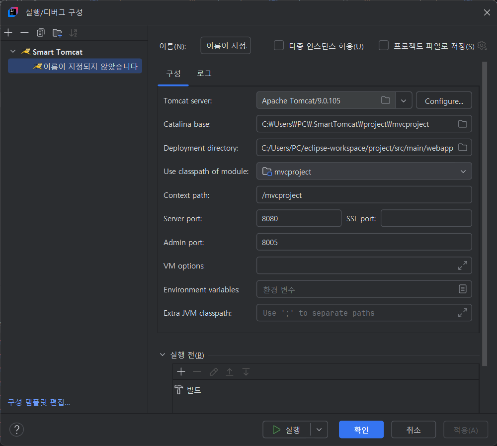 구성 편집 or Project -> BuildConfiguration에서 나의 Tomcat으로 설정해주어야 한다.