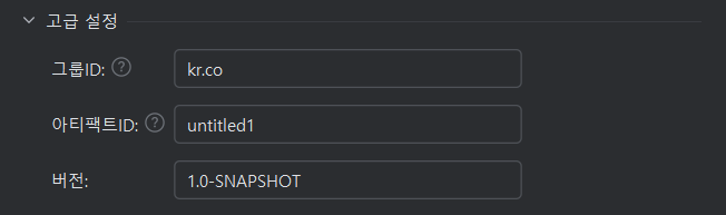 이름, 위치는 자유이고, 그룹 아이디는 도메인, 버전은 나중에 고쳐줄 것이기 때문에 기본으로 하였다.