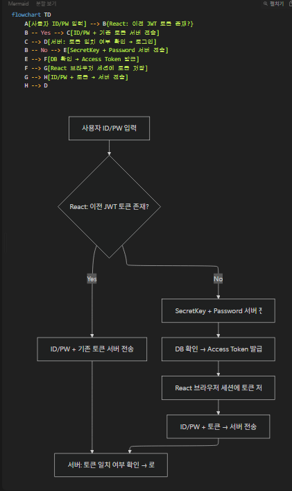 A[사용자 ID/PW 입력] --> B{React: 이전 JWT 토큰 존재?}