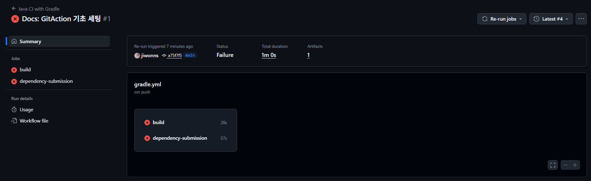 일단 실행이 되는지 확인해보기 위해 다시 Action으로 이동해보면,