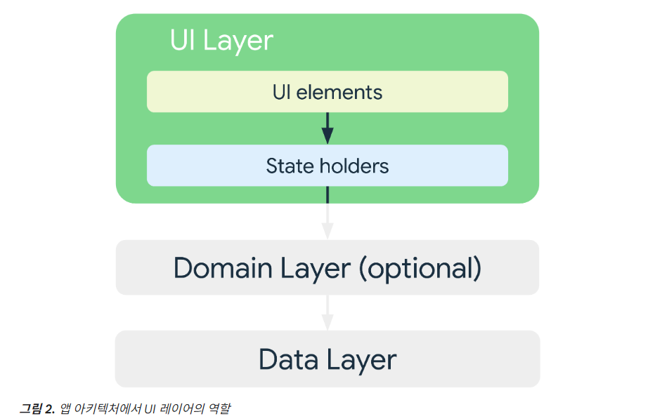 UI 레이어 (프레젠테이션 레이어)은 화면에 앱 데이터 표시이며, 사용자 상호작용 (버튼 누르기, 클릭) 또는 외부 입력 (네트워크 응답)으로 인해 데이터가 변할 때마다 변경사항을 반영하도록 업데이트되어야 한다.