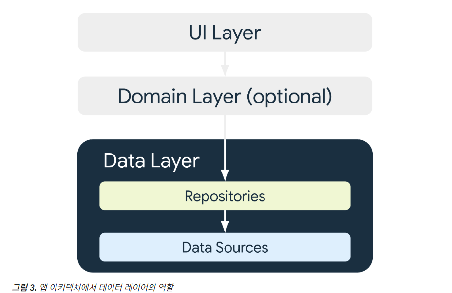 데이터 레이어는 여러 데이터 소스를 각각 포함할 수 있는 저장소로 구성된다. 앱에서 처리하는 다양한 유형의 데이터별로 저장소 클래스를 만들어야 한다. (Repository)