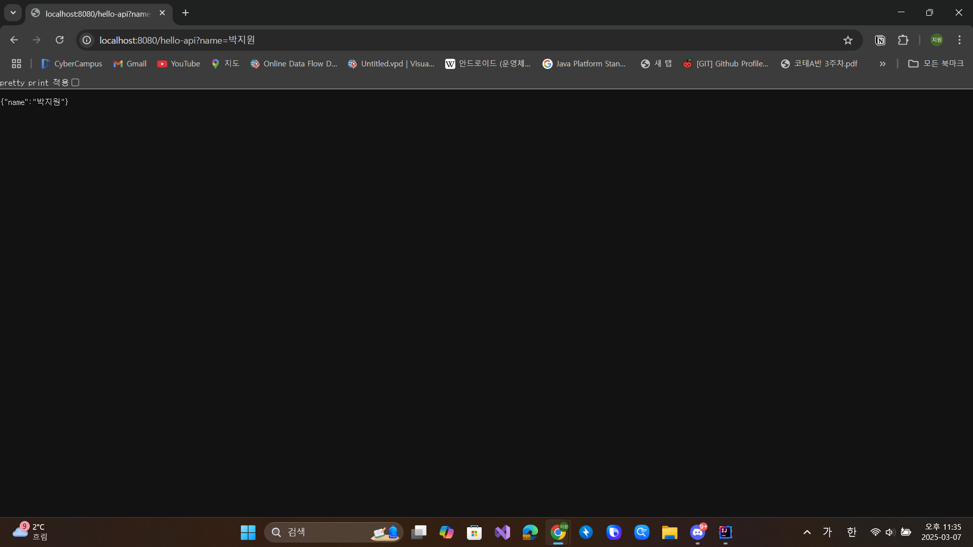 먼저 @GetMapping을 사용하면 주소창에 "/"를 기준으로 입력하여 값을 볼 수 있다.