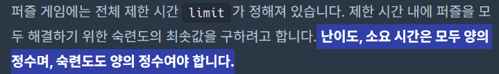 퍼즐 게임에는 전체 제한 시간 limit가 정해져 있습니다. 제한 시간 내에 퍼즐을 모두 해결하기 위한 숙련도의 최솟값을 구하려고 합니다. 난이도, 소요 시간은 모두 양의 정수며, 숙련도도 양의 정수여야 합니다.