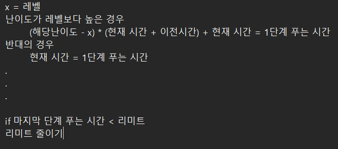 만약 줄여나가는 도중, 리미트보다 푸는시간이 더 높아질 경우, false를 리턴하고, 시도한 값에 1을 붙여 리턴해주면, 레벨의 최솟값이 된다.